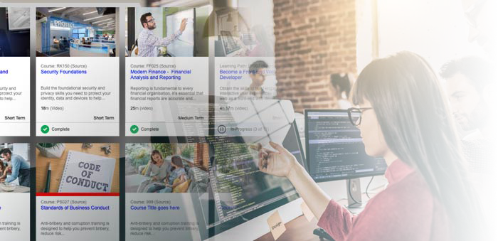 The UX design allowed searching for courses from multiple sources on any page. In other words, integrating multiple LMS systems but presenting search results consistently using a card metaphor. Any course displayed would also include related courses and functionality was added to recommend, review, share and save courses (to My Learning).